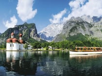 St. Bartholomä, das Wahrzeichen des Königssees, ist nur mit dem Schiff erreichbar. Die weltbekannte Wallfahrtskirche, deren erste Bauteile aus dem 12. Jhdt. stammen, liegt malerisch auf einer Halbinsel. Daneben steht das ehemalige Jagdschlößchen, das heute als idyllisches Gasthaus dient.